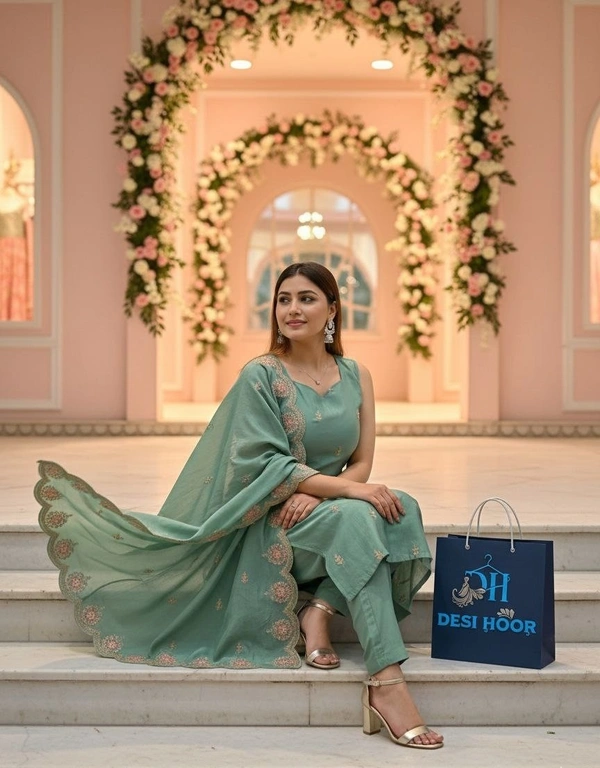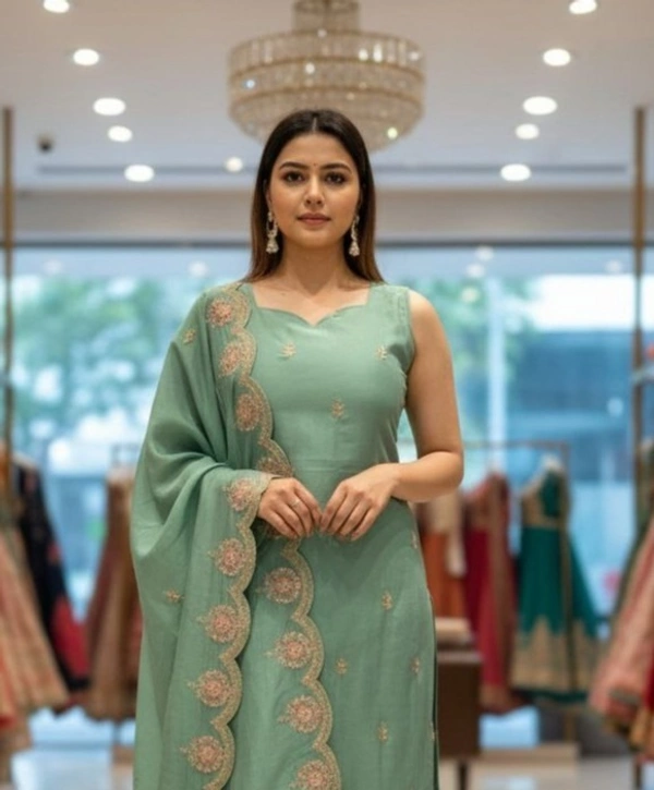 Add a royal touch to your ethnic wardrobe with this green embroidered kurta set, designed for elegance and comfort. The kurta comes with delicate golden thread embroidery motifs all over, paired with straight-fit pants. The highlight of the outfit is the embroidered dupatta with rich scalloped borders, giving it a luxurious festive look.