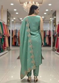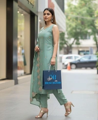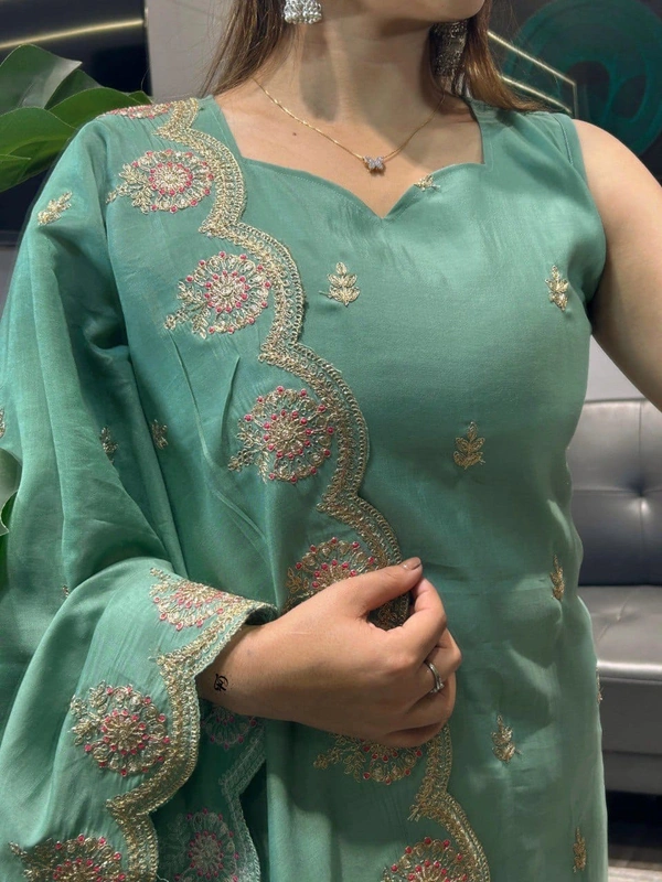 Women’s Sea Green Embroidered Kurta Set with Pants & Dupatta