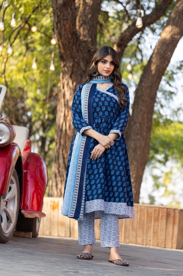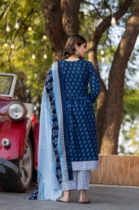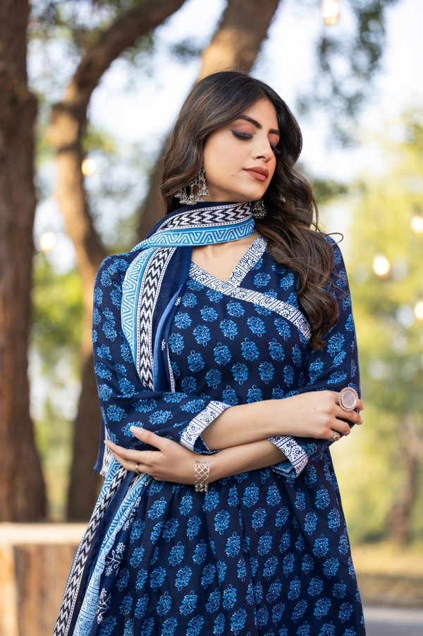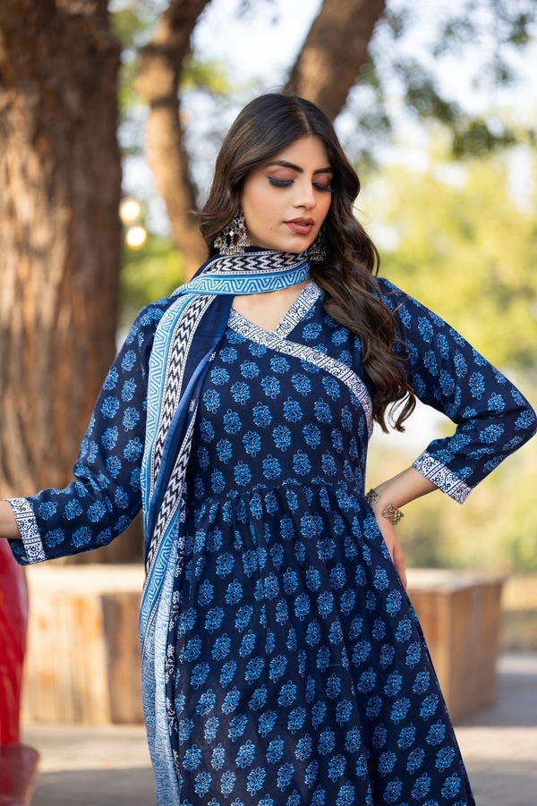 Women Printed Cotton Kurta Pant with Dupatta Set – Navy Blue