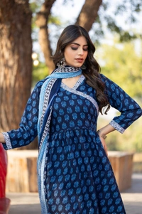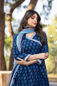 Enhance your ethnic wardrobe with this elegant navy blue printed cotton kurta set. Crafted from soft and breathable cotton fabric, the kurta features a stylish floral print with contrast detailing on the neckline and sleeves. It comes paired with a matching printed pant and a beautifully designed dupatta that completes the traditional look.